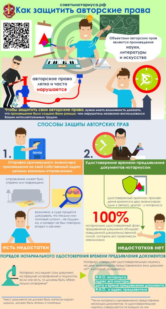 Есть значительно более надежный и современный способ защиты авторских прав, который не имеет обозначенных выше недостатков. Защитить плоды интеллектуального труда возможно с помощью удостоверения времени предъявления документов нотариусом. Прежде чем передать издателям или любым другим третьим лицам свое произведение, автор может обратиться в любую нотариальную контору за совершением этого нотариального действия.