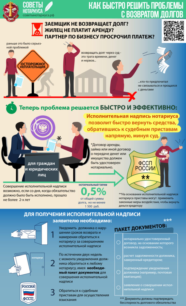 Исполнительная надпись нотариуса позволяет избежать целого ряда издержек, которые возникнут, если вы будете решать тот же вопрос через суд. Она экономит время — весь процесс занимает чуть более двух недель. Вы сбережете средства — тариф за данное нотариальное действие составляет всего 0,5% от общей суммы долга, но не менее 1,5 тыс. руб. Стоимость тарифа включается непосредственно в сумму взыскания. В то же время при судебном взыскании госпошлина составляет в среднем 0,5 −4% в зависимости от суммы иска.