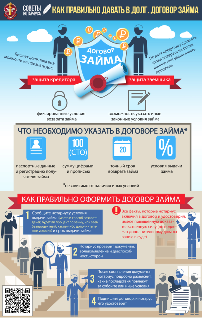 Сейчас, когда нотариальный акт обрел исполнительную силу, возврат долгов как физических, так и юридических лиц больше не является проблемой. Главное — совершить передачу денег правильно, оформив все документы должным образом. Необходимо вместе с нотариусом составить договор займа, который нотариус удостоверит только после того, как убедится, что воля сторон соответствует волеизъявлению, разъяснит последствия договора для всех лиц, которые его подписывают. В таком договоре детально прописываются все условия до мельчайших подробностей: проценты, под которые выдаются средства, место и срок возврата, условия возврата, график погашения долга.